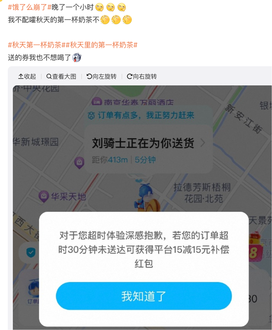 另有网友发文称:“秋天的第一杯奶茶,晚了一个小时”。对此,饿了么客服回应称,“对于您超时体验深感抱歉,若您的订单超时30分钟未送达可获得平台15减15元补偿红包。”