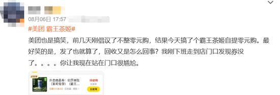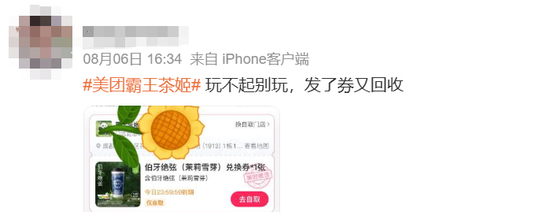 据悉,有大量网友称通过美团 “神抢手” 活动领取的霸王茶姬 “伯牙绝弦” 兑换券(价值17元),在短时间内被系统强制收回,部分用户发现 “附近暂无可取门店”,还有些用户的券直接消失,网友称:“站在店门口很尴尬”。