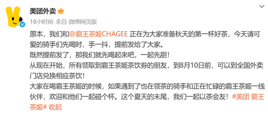 8月6日,美团外卖发博回应:原本,我们和霸王茶姬正在为大家准备秋天的第一杯好茶,今天请可爱的骑手们先喝时,手一抖,提前发给了大家。既然提前发了,那我们就先喝起来吧,一起先甜!