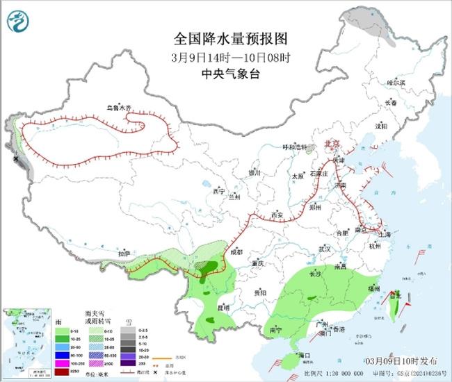图1 全国降水量预报图(3月9日14时-10日08时)
